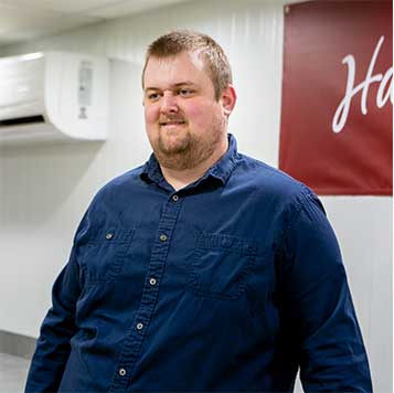 The man that keeps the lights on at the shop today, Greg is the Production Manager at Hall’s. He wears the catch-all responsibility of scheduling employees, managing inventory, and overseeing operations and is claimed to be the best, most laid-back, and even-keeled manager there ever was. Not only does he oversee strategic business developments, product line plans, and market and technology adjustments, but he also can be found stirring the candy kettle, packing a customer order, and cleaning up shop at the end of the long day. He truly does it all. Greg’s hobbies include weightlifting, video games, and relaxing with his family, and though he doesn’t crack often, you might catch him sneaking a Milk Chocolate-Covered Oreo on the chance occasion.