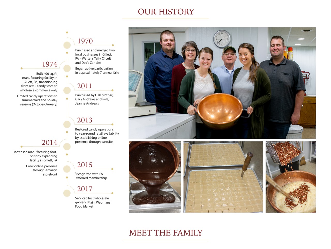 In 2011, Hall’s was purchased by youngest Hall brother, Gary Andrews and wife Jeanne Andrews, who established an online store. With a flourishing online presence, operations extended to year-round retail availability and our devoted customer base grew from the East Coast to the West. Now, also growing into wholesale commerce, the Hall family finds their small, family-owned and operated business a nationwide family favorite. Even more committed to our core values of superior quality, premium ingredients, and delicious treats, we remain committed to delighting many a sweet tooth through the highest quality confectioneries. We hope to bring a little extra cheer into our friends’ and valued customers’ homes as we look forward to the next 50 years!